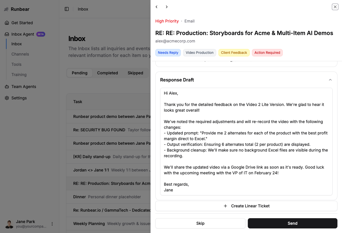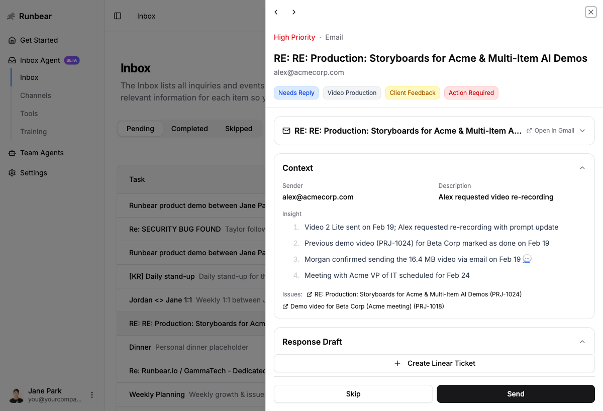 - Open Inbox Agent in the Runbear app.