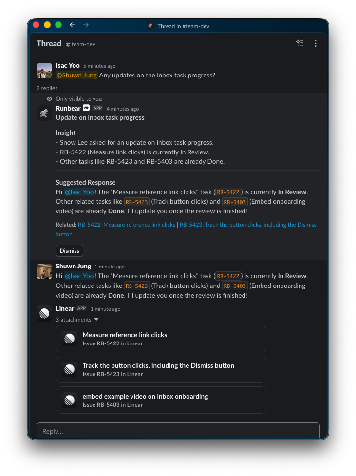 When someone mentions you in a Slack channel, Inbox Agent reads the conversation, pulls in relevant context from your connected tools, and generates a suggested reply. The suggestion appears as an ephemeral message — visible only to you, not to the rest of the channel.