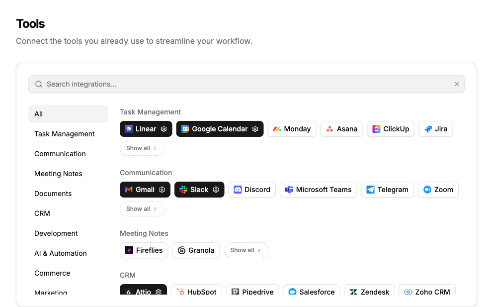 Give Inbox Agent access to the internal context it needs to write genuinely useful suggestions — not generic ones. By connecting tools, you let the agent reference your actual work when drafting replies and preparing meeting briefs.