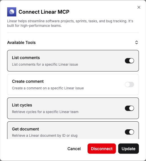 Inbox Agent uses the same tool catalog as Team Agent. Any tool you see available for Team Agent is also available for Inbox Agent. This means you configure a tool once and it can be used across both contexts.