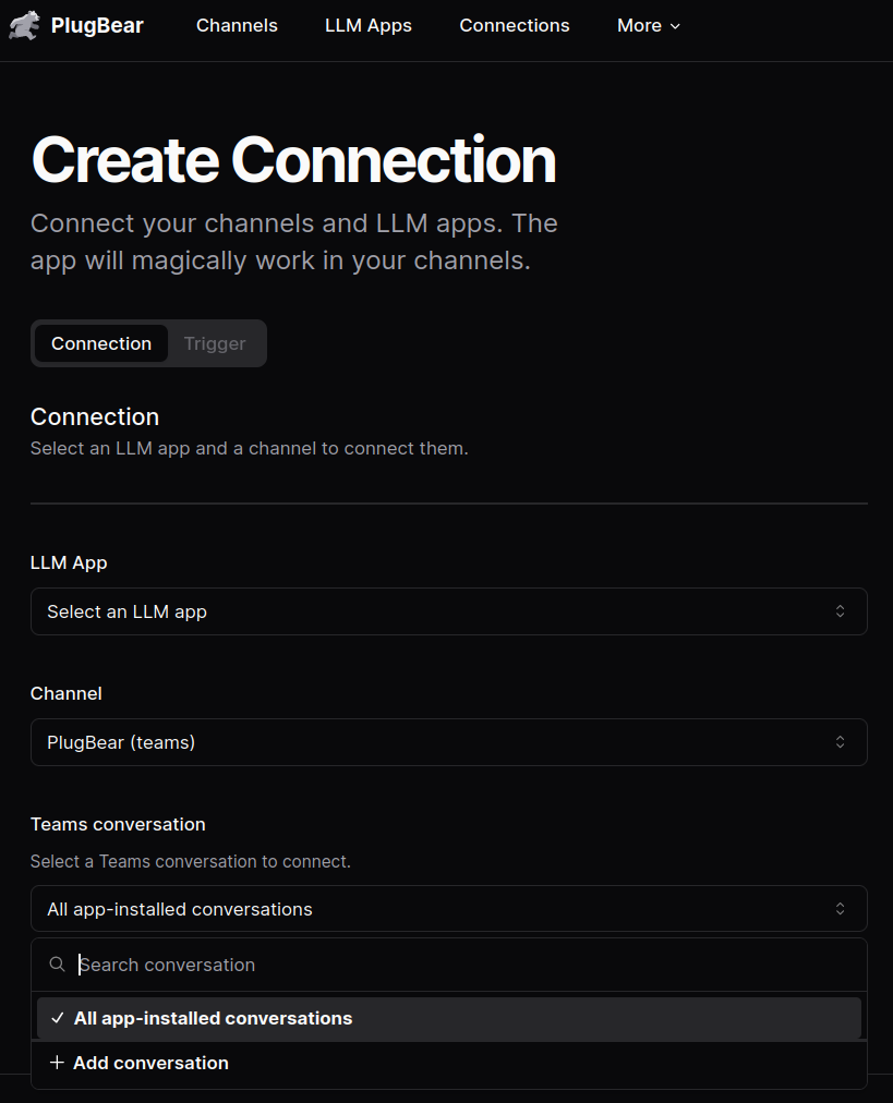 If your team or group chat doesn't appear during setup, the Runbear app likely isn't installed there yet. Click + Add conversation in the dropdown and install the app in your desired team or group chat. Refresh the connection page afterward.